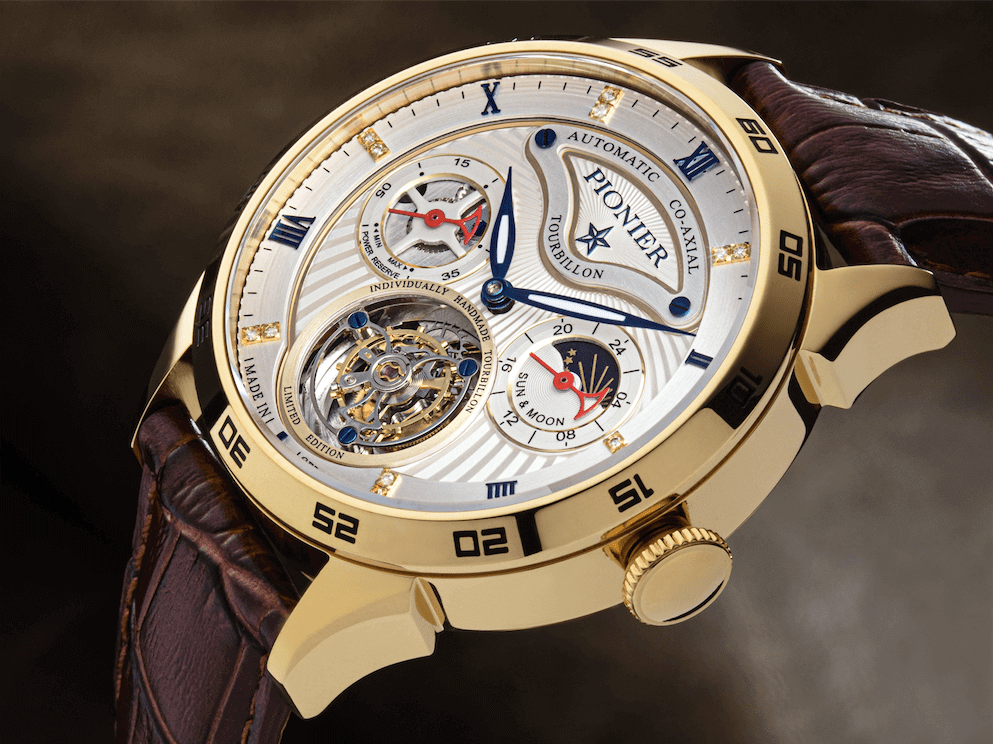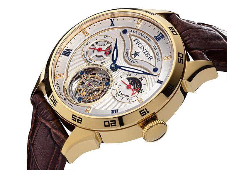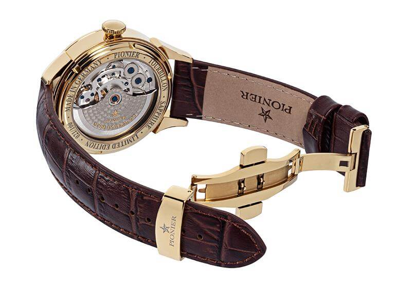 Individually handmade German engineering for something unique, bold, and different. A luxury 12 diamonds Tourbillon which will fascinate any timepiece lover. This masterpiece is in a constant state of motion and will energize you along. The Made in Germany Geneva Automatic Co-Axial Pionier is a powerful limited edition wristwatch.